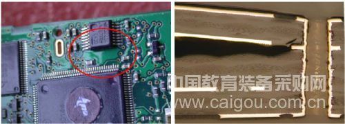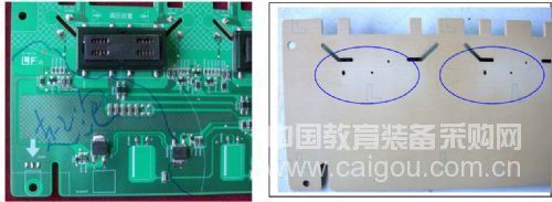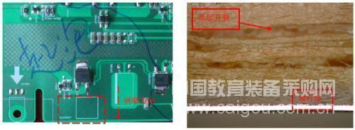 圖1 爆板樣品的局部  圖2 失效樣品背面的局部外觀(淺色部分對應的另一面為大器件―電磁繼電器)
