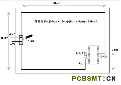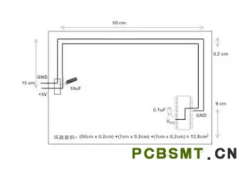 此電路板上,設計出的環路面積為697cm2。采用圖3所示的方法,電路板上或電路板外的輻射噪聲在環路中感應電壓的可能性可大為降低。