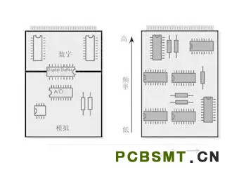 圖4 (左)將數字開關動作和模擬電路隔離,將電路的數字和模擬部分分開。 (右) 要盡可能將高頻和低頻分開,高頻元件要靠近電路板的接插件