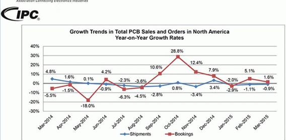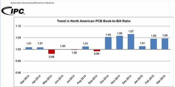 2015年4月29日,美伊利諾伊州班諾克本 — IPC — 際電子工業聯接協會發布《3月份北美地區PCB行業調研統計報告》。報告顯示3月份銷售雖然低迷,但是訂單量超過去年同期水平,致使訂單出貨比穩定在1.05。