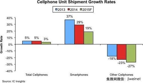 至于非智慧型手機出貨量在2013年與2014年分別萎縮了18%與23%,IC Insights預期,2015年非智慧型手機出貨量的縮減幅度將超過2014年的27%;整體手機市場出貨量在2014年成長僅5%,預測2015年的成長幅度為3%。