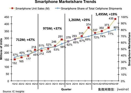 智慧型手機的出貨比例在2013年一季首度超過整體手機市場當季出貨的五成,市場研究機構IC Insights估計,到2015年四季,智慧型手機出貨量將達到4.35億支,達到整體手機市場出貨量的八成;而該比例將在2018年進一步達到93%。