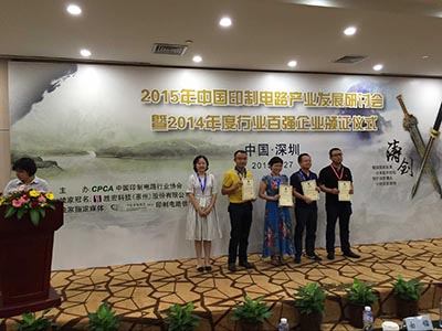 2015年7月27日,由中印制電路行業協會主辦的“2015年中印制電路產業發展研討會”在深圳明華際會議中心隆重召開,會議期間頒發了2014年度中印制電路行業百強企業證書。