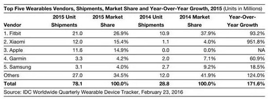 導(dǎo)致這一結(jié)果出現(xiàn)的原因主要是三種勢力的崛起,一種勢力當(dāng)然是蘋果的,盡管Apple Watch發(fā)布后飽受非議,但蘋果品牌的巨大慣性依舊無人能比。二種勢力是小米的上升。2014年,小米的發(fā)貨量僅有110萬臺,市場占有率為4%,但2015年小米市場占有率已經(jīng)達(dá)到15.4%,成為僅次于Fitbit榜上老二,而位于蘋果、Garmin和三星之前。