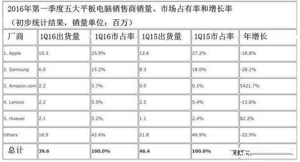 前兩大平板電腦制造商仍然保持著它們的地位:蘋果排在一名,三星排在二名。IDC公司稱,在2016年一季度,全球平板電腦的下滑主要是因為“季節(jié)性下滑”和“整體表現(xiàn)冷淡的消費者群體”。前五大平板電腦供應(yīng)商占全球平板電腦市場57.4%的份額,較去年同期的53.1%所有增長。
