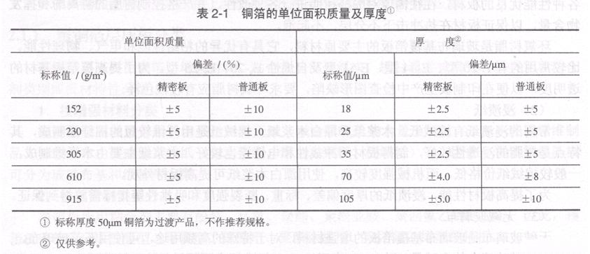 銅箔的表面應光潔,不得有明顯的皺折、氧化斑、劃痕、麻點、凹坑和玷污。305g/m2及以上銅箔的孔隙率要求在300ram×300mm面積內滲透點不超過8個;在0.5m2面積上銅箔的孔隙總面積不超過直徑為0.125mm的圓面積。305g/m2以下銅箔的孔隙率和孔尺寸由供需雙方商定。銅箔的單位面積重量及厚度應符合表2.1規定。