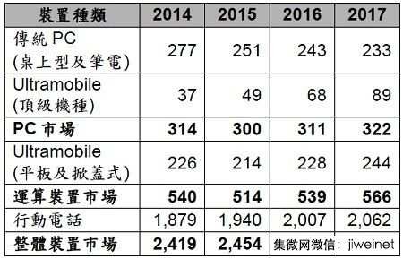 2015年ultramobile市場(平板及掀蓋式)也將呈現萎縮局面。據估2015年ultramobile出貨量將達到2.14億臺,較前一年下滑5.3%。其中,2.07億臺為平板設備,較2014年下滑5.9%。