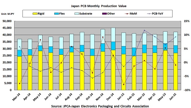 日本2015年6月PCB總產(chǎn)值: 44,152 百萬日元