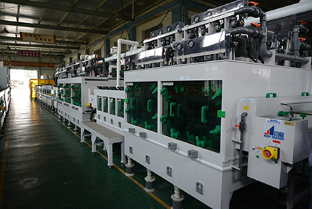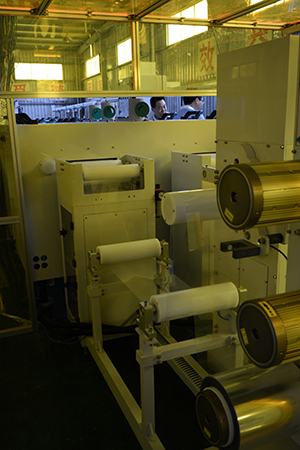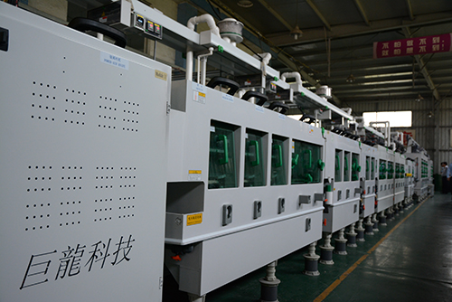 在閆董的帶領(lǐng)陪同下,GPCA/SPCA一行參觀了巨龍自主研發(fā)制造的RTR/DES生產(chǎn)線。據(jù)介紹,RTR/DES生產(chǎn)線的大特點(diǎn)在于卷對(duì)卷、水平雙工位作業(yè),該DES線的過板能力薄0.036mm,板寬度為250mm,同時(shí)能生產(chǎn)兩種不同規(guī)格的產(chǎn)品,大大提升了生產(chǎn)效率;同時(shí),此DES線還配置了真空蝕刻工藝,有效防止“水池效應(yīng)”、提高蝕刻均勻性,目前在片對(duì)片實(shí)驗(yàn)中極差值已達(dá)到了94%以上,量產(chǎn)可達(dá)到40um/40um。該DES線不僅節(jié)省了勞動(dòng)成本、提高了整體的生產(chǎn)效率,還有效保證軟板的品質(zhì),使軟板生產(chǎn)技術(shù)更上一個(gè)臺(tái)階。