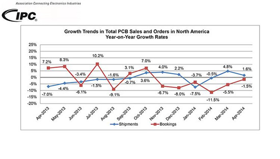 2014年4月份北美地區PCB總出貨量,同比增長1.6%,把年初至今的出貨量推高至-0.2%。與上月相比,PCB出貨量環比下降12.0%。